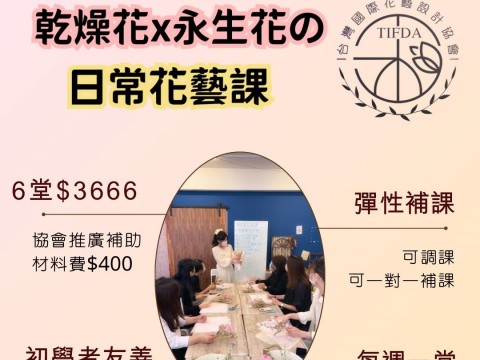 從零開始:永生花&乾燥花の生活美學課 2026冬季花藝初階課程 6堂 $3666 每次上課,都由老師精心準備當季花材,請在每堂上課時繳交材料費$400 (也可一次付清$400x6=$2400) 課程內容涵蓋6大範圍: 插花、花束、花圈、玻璃...